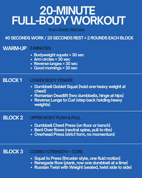 I use them to work out on my schedule, with zero driving required, and move on with my day. So I was thrilled when our friend Kristin McGee shared this 20-minute full-body workout with us, as a preview of the content in her new app, Kristin McGee Movement. And if you want to try even more (which I'm sure you will), she’s offering a 7-day free trial.