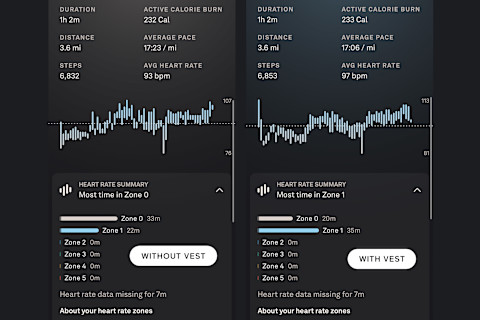 So while calorie burn and pace stayed almost identical, the vest did nudge my heart rate upward enough to spend more time in a higher effort zone.