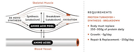 Many people associate protein needs with growing children, but childhood muscle growth represents a daily gain of less than five grams of protein. Instead, the human body’s major protein requirement fuels something called protein turnover. Every protein in your body has a working lifespan, and just as you need to replace the windshield wipers of your car, your body needs to continuously replace proteins. Whether you are sixteen or sixty- five, your body must replace 250 to 300 grams of protein daily. The quantity and quality of protein in your diet become increasingly more important with each birthday.
