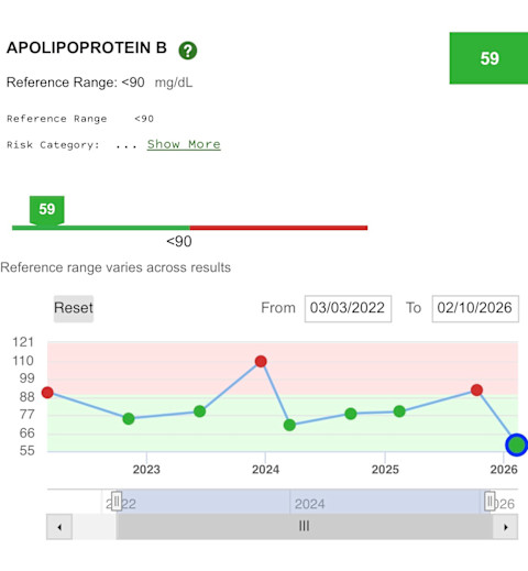 The outcome? My ApoB is now at 59, the lowest it's ever been, which most cardiologists would describe as "excellent" rather than just "good" in terms of cardiovascular risk standards.